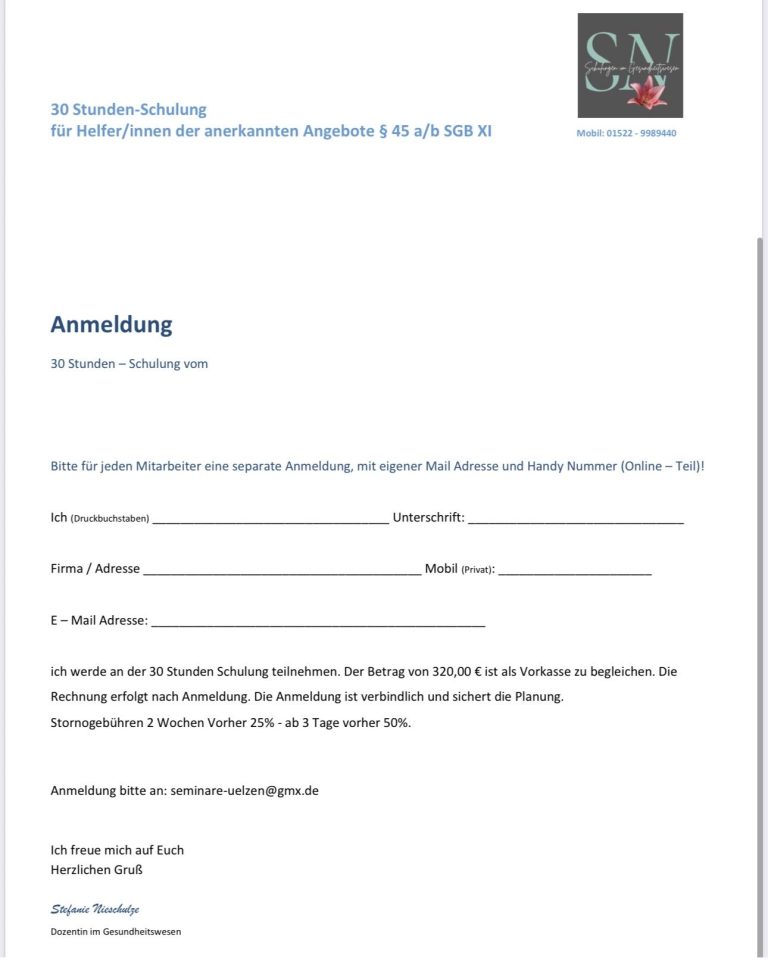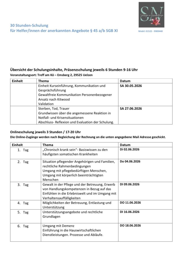 30-stündige Qualifizierung zur Helferin bzw. zum Helfer gemäß § 45a/b SGB XI mit anerkanntem Zertifikat. Die Maßnahme ist durch das Landesamt zugelassen.